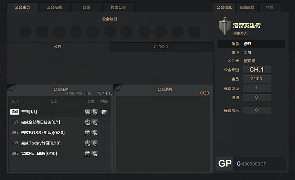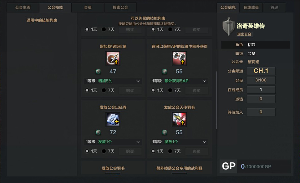 - 公会长和管理员可使用GP点数购买公会技能,